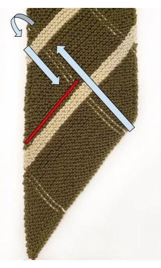 The scarfs’ asymmetric shape is worked with a 2 row repeat. Every other Row, RS Row, work a a kfb at the beginning of the row, and a k2tog at the end of the row to create the slanting shape.