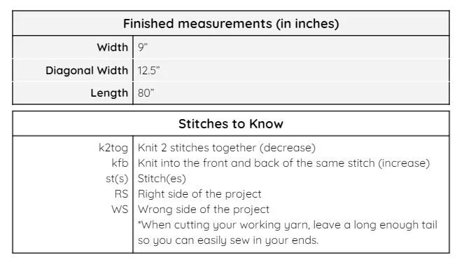 The Scarfs’ asymmetric shape is formed by repeating the following two row repeat for the entire scarf. Switch color rows when indicated.