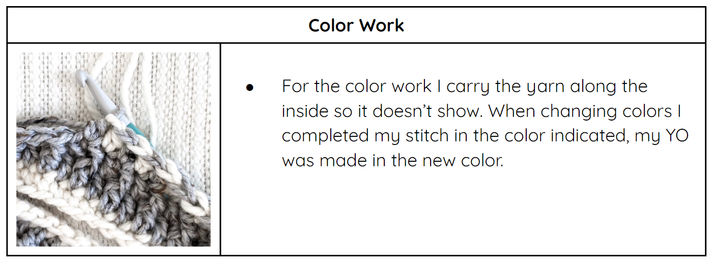 Working these up in different color combos will give each one a unique feel too. The color change is made by switching the yarn wrapped around the hook while the other yarn is carried in the back. With crochet this is very easily archived because the stitches are secured so you can adjust tension as you go.