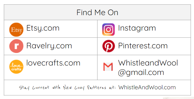 **This Pattern is a copyright of Whistle and Wool© so you may not copy, alter, adjust, share, record, redistribute or resell my Pattern. No tutorials or any kind of demonstrations may be made using any information contained in my Pattern. I do not mind if you wish to sell a completed HANDMADE item and you are a small independently owned business, however, you do not have permission to use ANY of my photos. If you do sell a completed item, please list credit of the design belonging to me, Whistle and Wool and a link to my shop. www.WhistleandWool.etsy.com